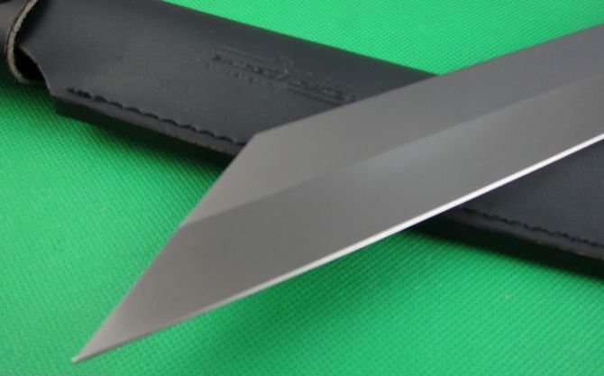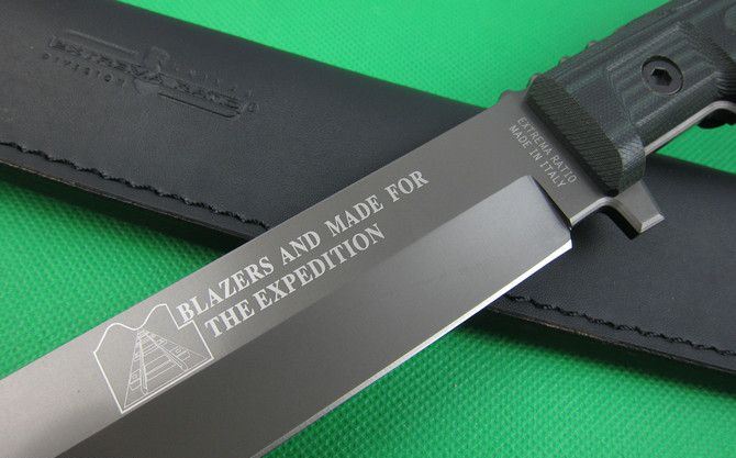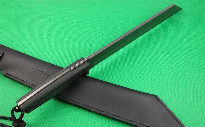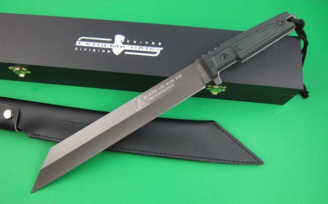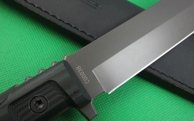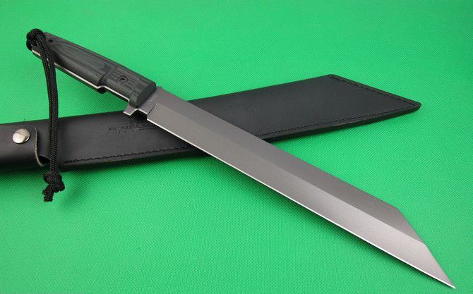 全长:43cm 刃长:29cm 柄长:13cm 刃厚:0.57cm 刃宽:4.2cm 刃材:5Cr13 柄材:G10 硬度:56HRC 净重;600克 毛重:1150克 表面处:镀钛 其他:木盒包装+真皮套