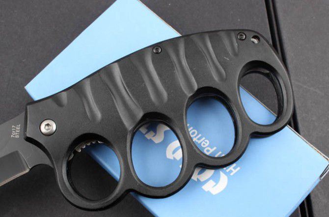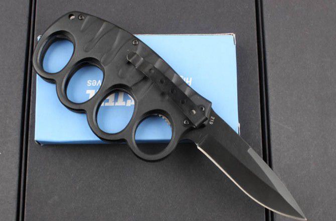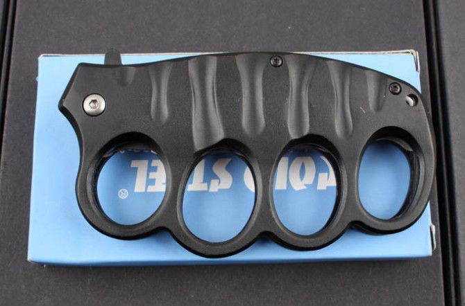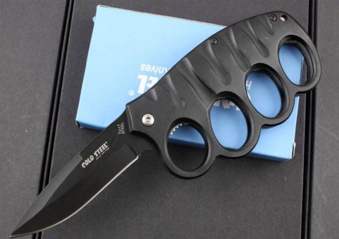 冷钢—219拳套折刀 全 长:20cm 刃 长:8.5cm 柄 长:11cm 刃 厚:0.28cm 刃 材:7Cr17 柄 材:铝 硬 度:58HRC 表 面:氧化黑 重 量:170g