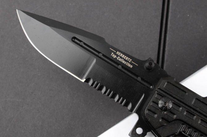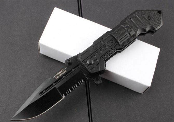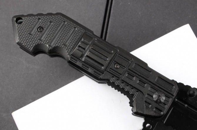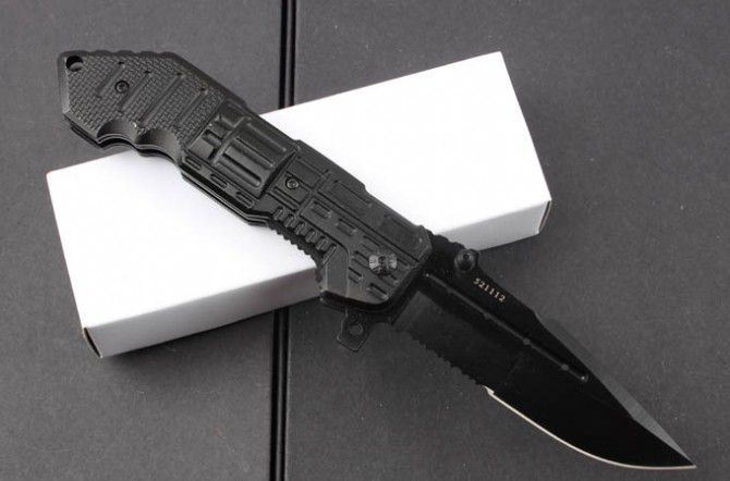 黑枪折刀 全 长:215mm 刃 长:94mm 柄 长:120mm 刃 宽:32mm 刃 厚:3mm 刃 材:5Cr13Mov 重 量:201g(含包装) 硬 度:57HRC 表 面 :氧化黑 柄 材:铝柄 锁 型:线锁 其 他:配纸盒