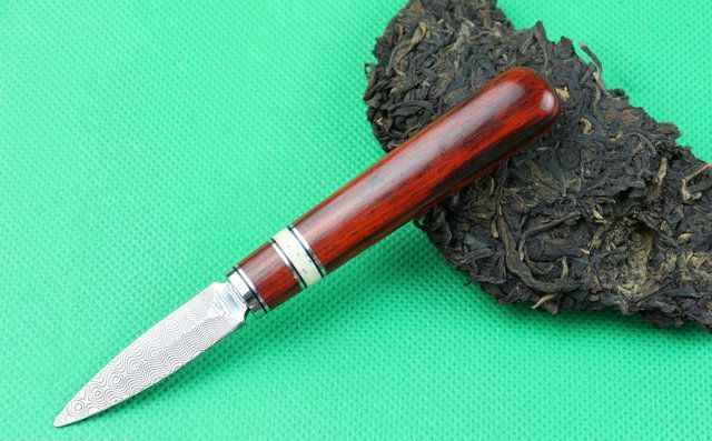 大马士革钢普洱茶扁头撬茶刀 全 长: 14.5cm 刃 长: 5.1cm 刃 宽: 1.5cm(最宽处) 柄 长: 9.2cm 硬 度: 59HRC 刃 厚: 0.8cm 重 量:110 克(含包装) 表 面: 纯手工制造 刃 材: 大马士革 柄 材: 钢头+兽骨+天然黄檀木 其 他: 配真皮套,大马士革钢花纹和把手木纹及颜色各异,以实物为准 .