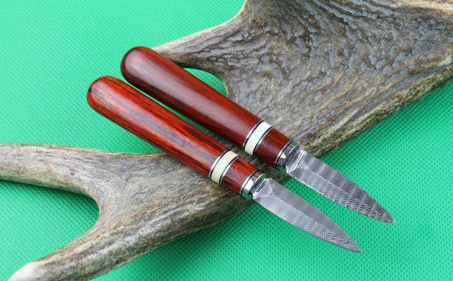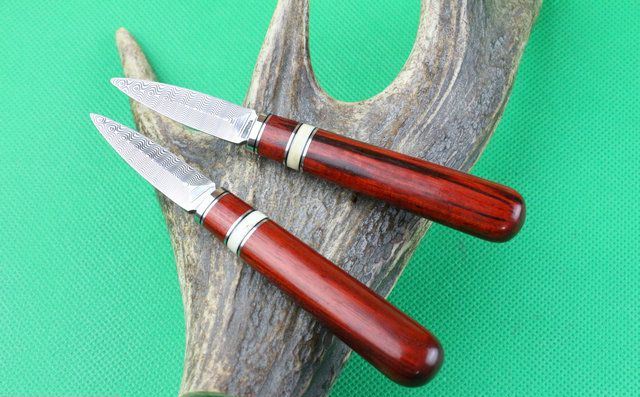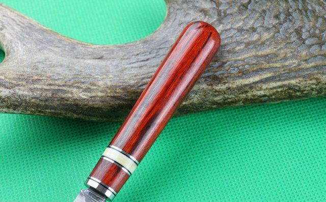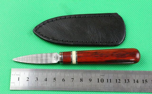 全 长: 14.5cm 刃 长: 5.1cm 刃 宽: 1.5cm(最宽处) 柄 长: 9.2cm 硬 度: 59HRC 刃 厚: 0.8cm 重 量:110 克(含包装) 表 面: 纯手工制造 刃 材: 大马士革 柄 材: 钢头+兽骨+天然黄檀木 其 他: 配真皮套,大马士革钢花纹和把手木纹及颜色各异,以实物为准 .