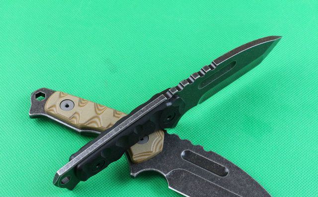全 长:23.2cm 刃 长:9.5cm 柄 长:12.2cm 刃 宽:4.7cm(最宽处) 刃 厚:5.9mm 刃 材:5crMov15 硬 度; 58HRC 刀 柄:黑G10柄 表 面:石洗+黑钛 结 构:一体龙骨 重 量:克 备 注:带K鞘套,绿黑刀柄,购买要注明颜色.