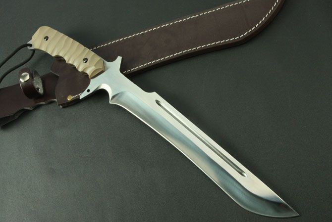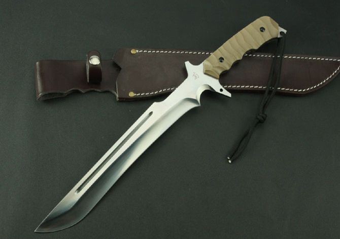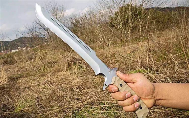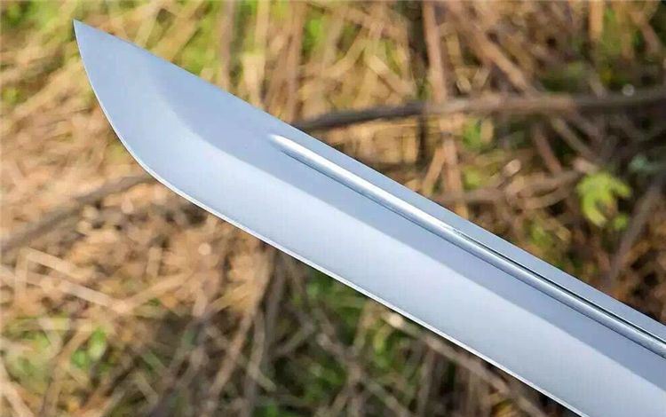 菊男S185大刀(镜光) 全 长:465mm 刃 长:285mm 柄 长:140mm 刃 宽:40mm 刃 厚:5.8mm 刃 材:5Cr13Wov 重 量:880g(含包装) 硬 度:58HRC 表 面:砂光 柄 材:沙漠色G10 锁 型:定锁 其 他:配皮套