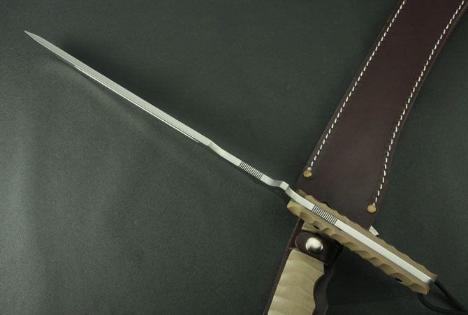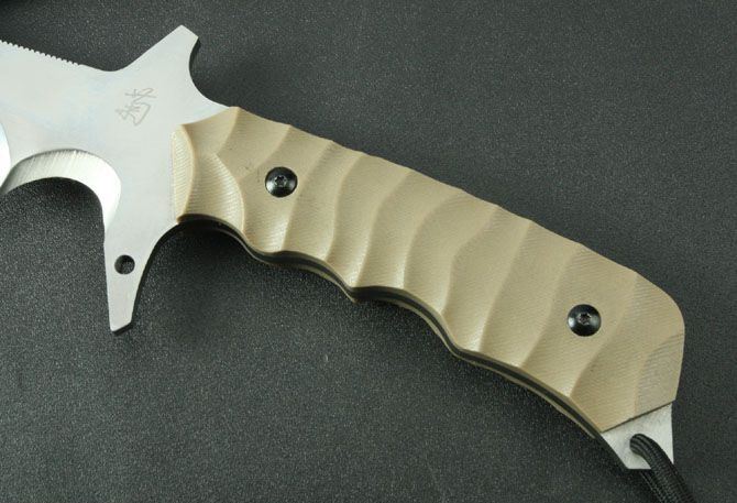 全 长:465mm 刃 长:285mm 柄 长:140mm 刃 宽:40mm 刃 厚:5.8mm 刃 材:5Cr13Wov 重 量:880g(含包装) 硬 度:58HRC 表 面:砂光 柄 材:沙漠色G10 锁 型:定锁 其 他:配皮套