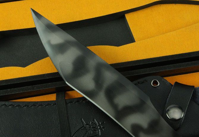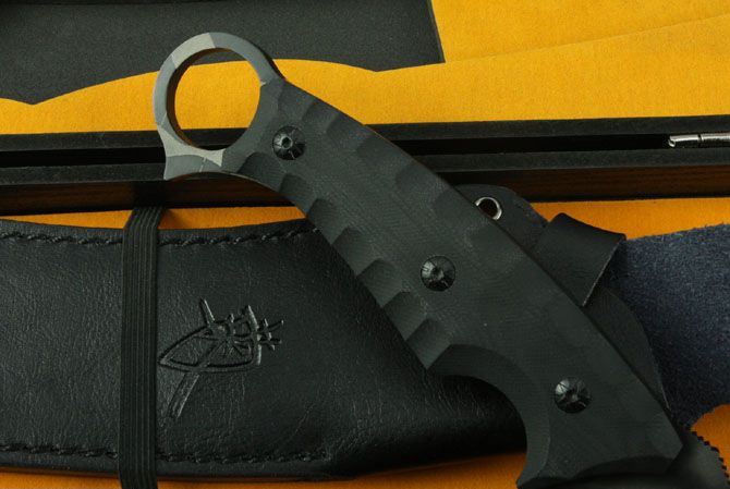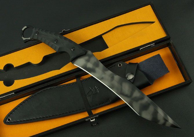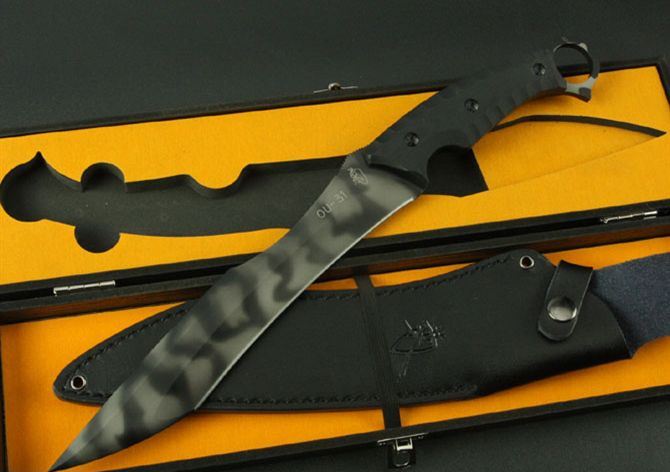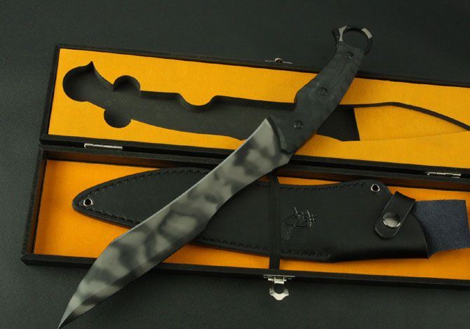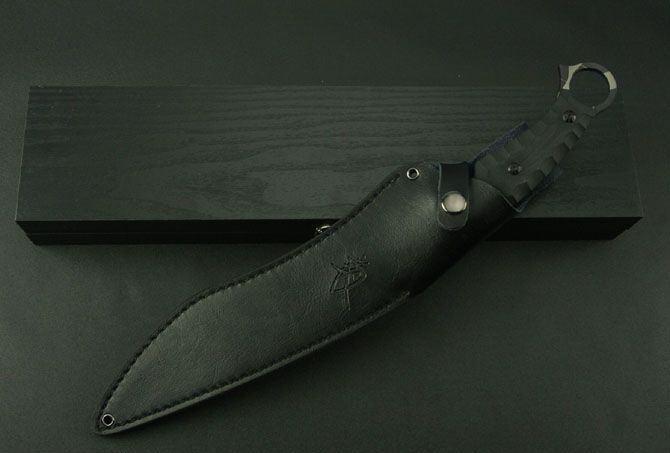 菊男将神弯刀(虎纺版) 全 长:380mm 刃 长:235mm 柄 长:127mm 刃 宽:35mm 刃 厚:5.3mm 刃 材:5Cr13Wov 重 量:1080g(含包装) 硬 度:57HRC 表 面:虎纺钛 柄 材:黑色G10 锁 型:定锁 其 他:配黑色牛皮套