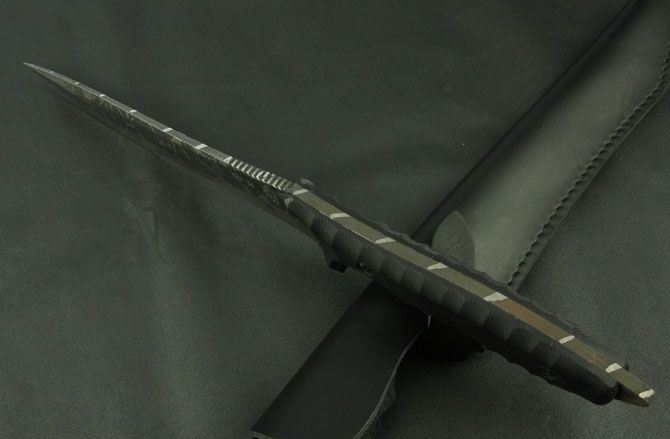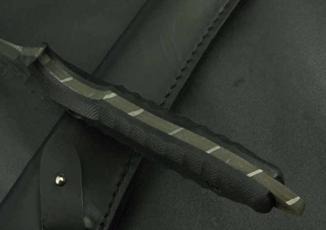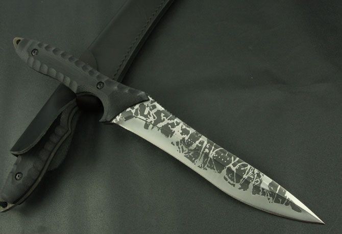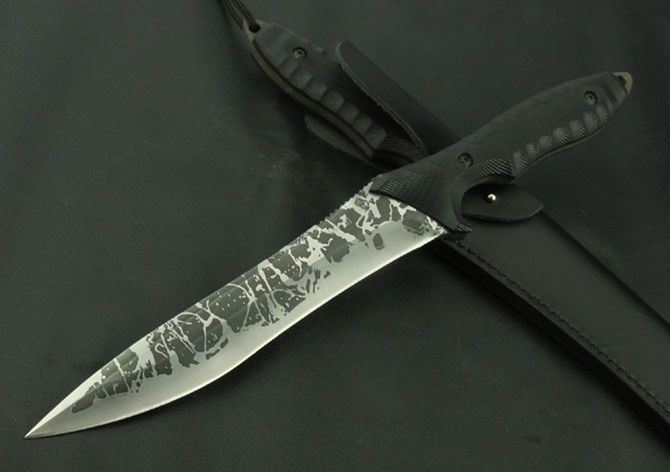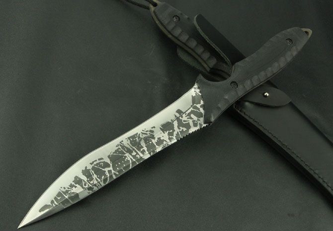 全 长:370mm 刃 长:195mm 柄 长:115mm 刃 宽:35mm 刃 厚:5.7mm 刃 材:5Cr13Mov 重 量:520g(含包装) 硬 度:56HRC 表 面:腐蚀 柄 材:G10 锁 型:定锁 其 他:配黑色牛皮套
