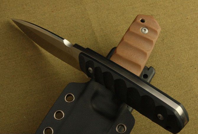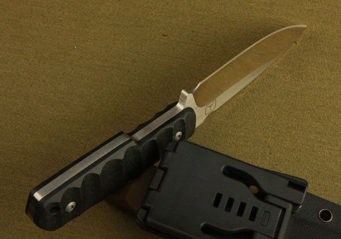 全长:21.8CM 刃长:11CM 刃材:9Cr13 硬度: 59HRC 刃厚: 0.5CM 刃宽:3.5CM (最宽处) 柄长: 10.7CM 柄材: G10 重量:320g(含包装) 四色:灰钛.虎纹.拉砂.沙漠色 刀鞘:K鞘