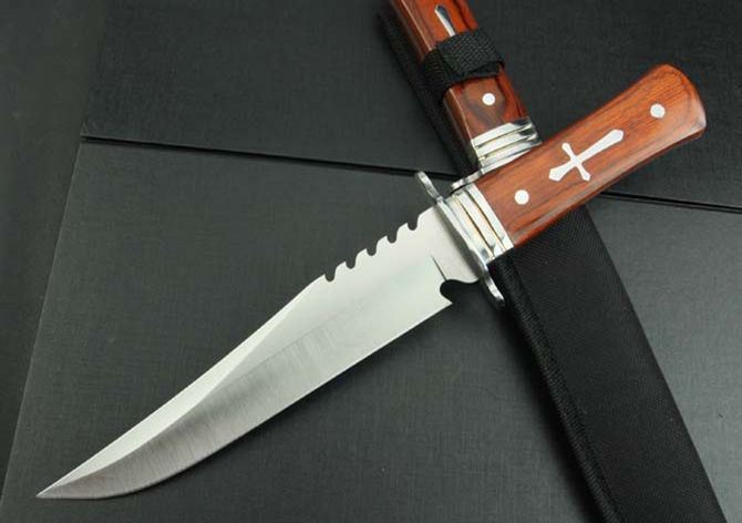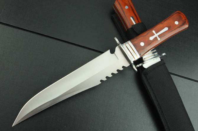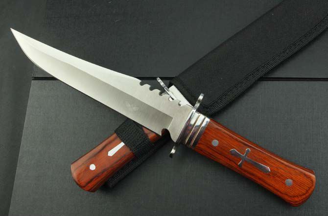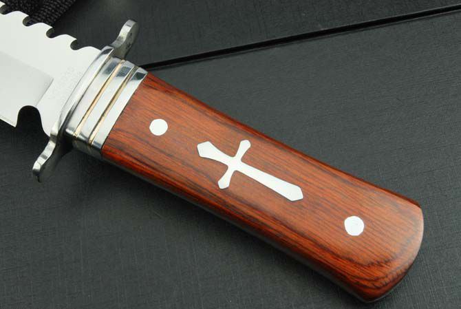 S035十字架直刀 全 长:322mm 刃 长:190mm 柄 长:122mm 刃 宽:38mm 刃 厚:3.5mm 刃 材:3Cr13Mov 重 量:320g(含包装) 硬 度:55HRC 表 面:砂光 柄 材:彩木柄 锁 型:定锁 其 他:配尼龙套