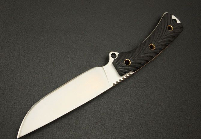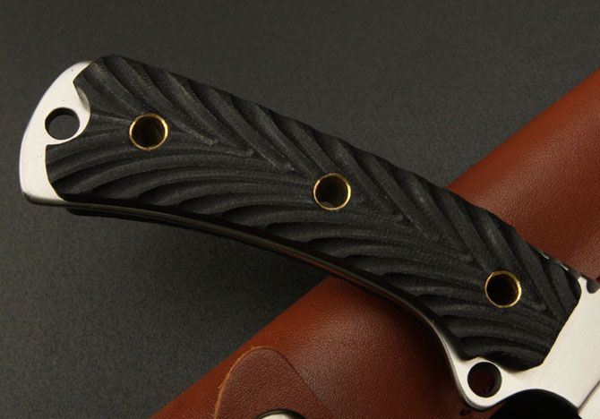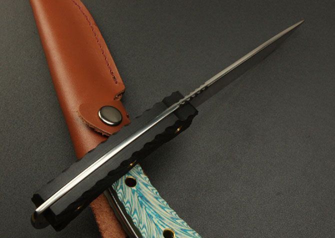 全长:23.7CM 刃长:11.5CM 刃材:7Cr17 硬度: 58HRC 刃厚: 0.37CM 刃宽:3CM (最宽处) 柄长: 11CM 涂层:砂光 柄材: 米卡塔 刀鞘:牛皮套 重量:230g