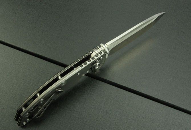 全 长:21cm 刃 长:8.5cm 柄 长:12.2cm 刃 宽:2.9cm(最宽处) 刃 厚:3.5mm 刃 材:D2高速钢 硬 度:60-62HRC 刀 柄:钛合金(表面经石洗处理) 表 面:丝光 锁定方式:侧锁 重 量:238克(含包装) 备 注:配硬纸盒和钛合金背夹(可上下调换)