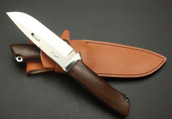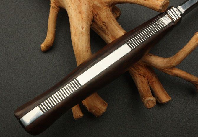 材质: YXR-7 HPC 全长: 25cm 刃长: 12.5CM 刃厚: 0.6 CM 刃宽: 3.8 CM 血槽: 无血槽 表面: 镀膜处理 硬度: 60 HRC 柄材: 高档奢华铁木木柄 工艺: 手工与数控精密 刀重: 300g 产地: 中国OEM