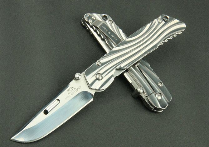 花田洋“信”全镜光折刀(配高档铝盒) 全长:21.8cm 刃长:9cm 柄长:12.5cm 刃厚:3.8mm 刃材: 7Cr17 柄材: 全钢镜光 硬度: 58HRC 重量:165克 表面处理:镜光 锁型:侧锁