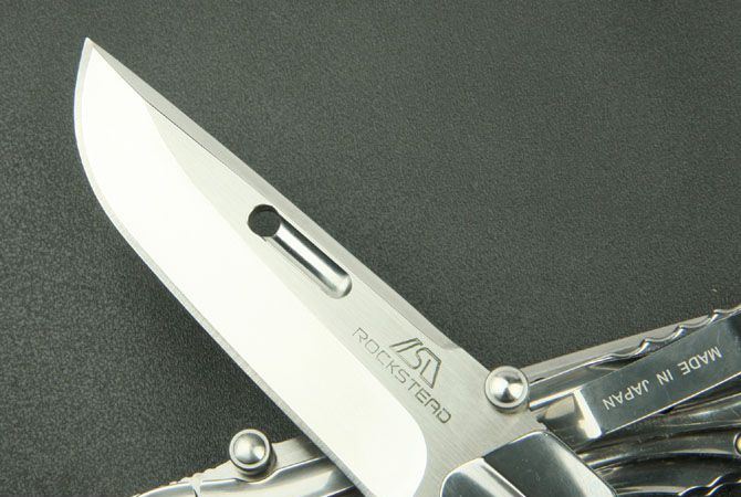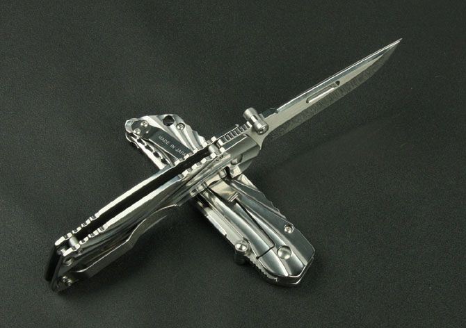 全长:21.8cm 刃长:9cm 柄长:12.5cm 刃厚:3.8mm 刃材: 7Cr17 柄材: 全钢镜光 硬度: 58HRC 重量:165克 表面处理:镜光 锁型:侧锁