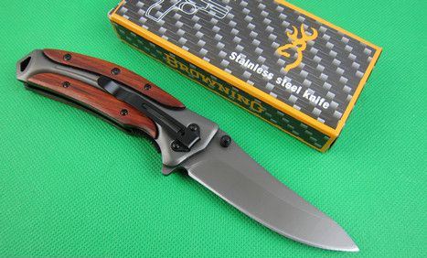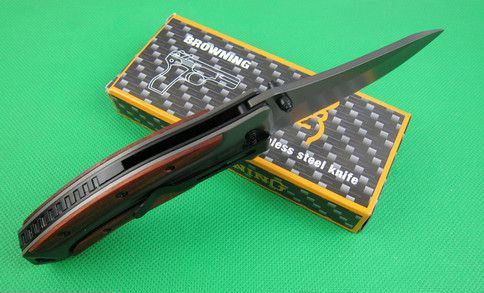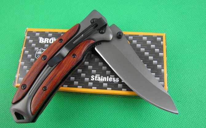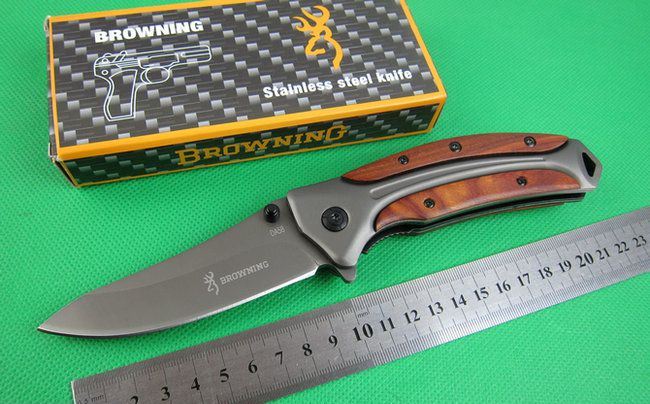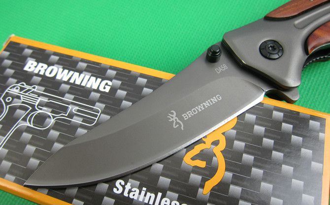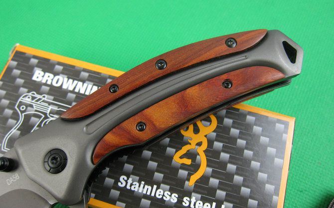 勃朗宁.DA58快开折刀 全 长: 22.1cm 刃 长: 9.5cm 刃 宽: 3cm(最宽处) 柄 长: 12.9cm 刃 材: 440 硬 度: 57HRC 表 面: 灰钛 刃 厚: 0.38cm 柄 材: 全钢伴木片 重 量: 290克(含包装) 包 装:原装纸盒 锁 闭: 侧锁