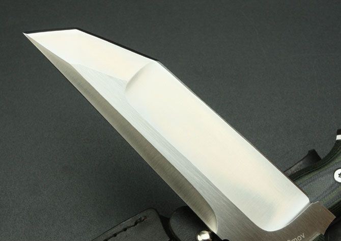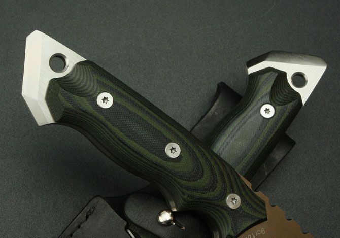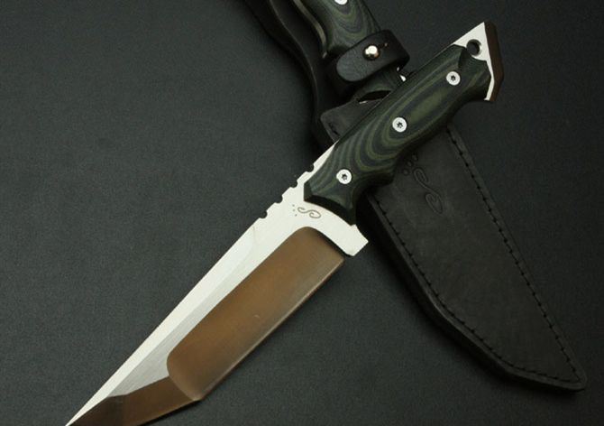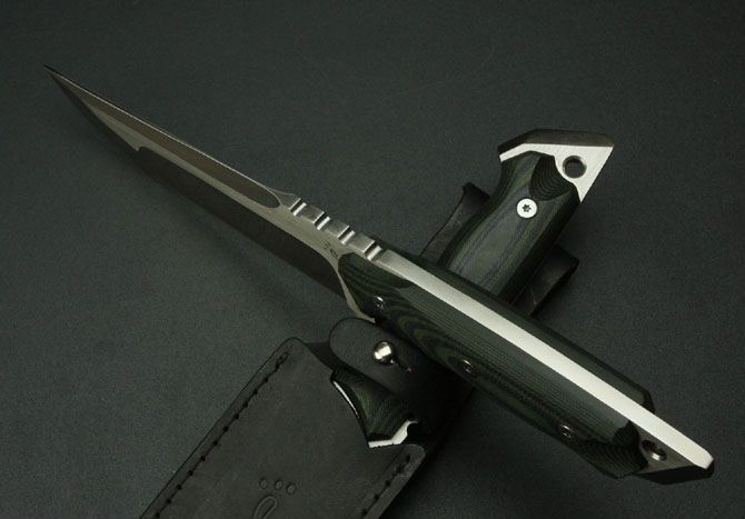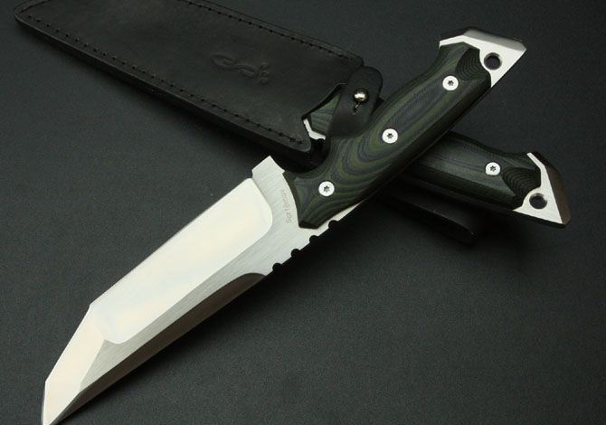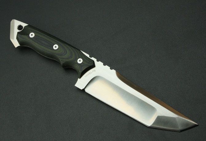 田边一寿直刀 全 长: 295mm 刃 长: 150mm 刃 厚: 6mm 刃 材: 9Cr18 硬 度: 58HRC 柄 长: 135mm 重 量: 510g 表 面: 砂光 柄 材: 米卡塔 刀 鞘: 皮套