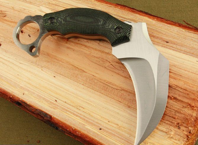 田边获奖作品—狂爪 全 长: 15.5cm 刃 长: 10cm 刃 宽: 3cm (最宽处) 刃 材: 5Cr13 硬 度: 57HRC 刃 厚: 0.53cm 柄 长: 11cm 表 面: 砂光 柄 材: 米克塔 重 量:210克(含鞘)
