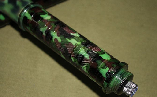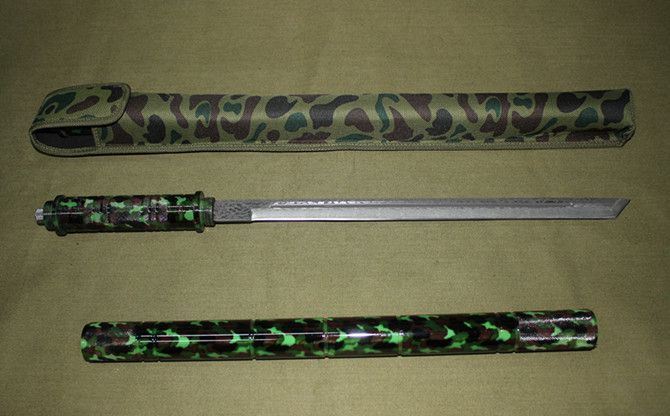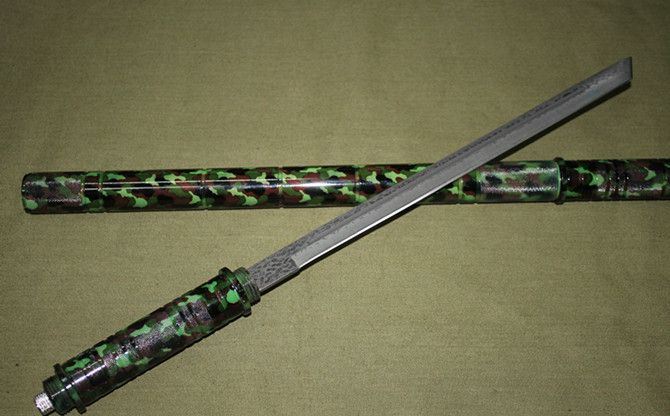 联合刀具—迷彩仿大马士革(配灯棍刀) 全长:55CM 刃长: 36CM 接长:96CM 管径: 3.2CM 刀厚:0.47CM 刃宽: 2CM 重量: 920g(含包装) 刃材:5Cr13Wov 硬度: 56HRC