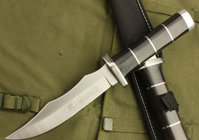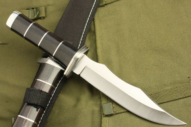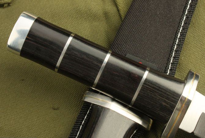 荣誉K36 全 长: 26.5cm 刃 长: 14.5cm 刃 宽: 2.8cm(最宽处) 柄 长: 11cm 刃 厚: 0.34cm 刃 材: 5Cr13Mov 硬 度: 56RHC(高硬度) 净 重: 230克(含套) 表 面: 砂光 柄 材: 彩木+钢圈+铜圈 其 他:尼龙套