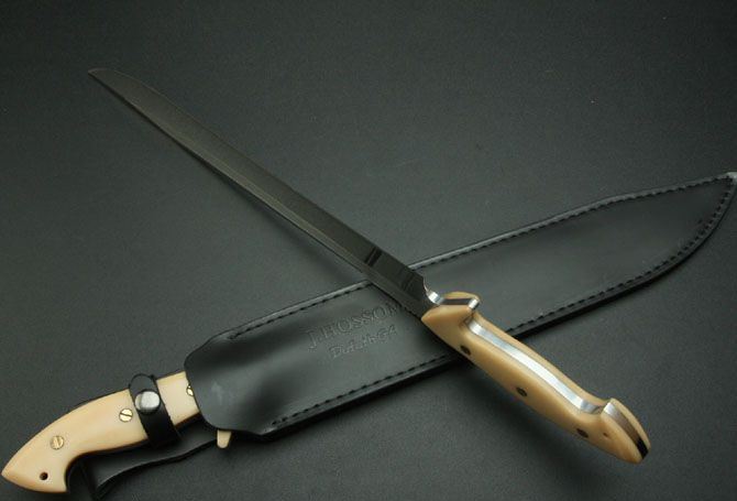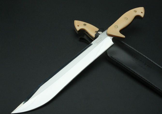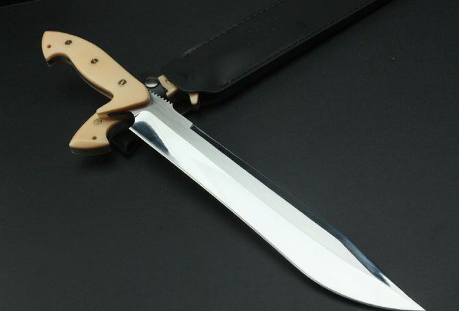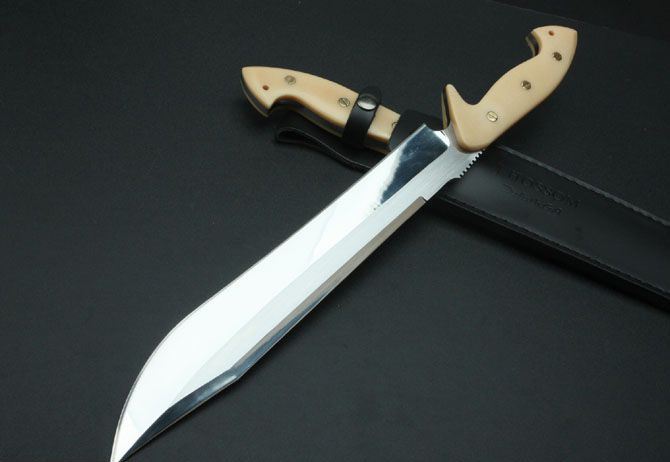 全 长:480mm 刃 长:325mm 刃 宽:50mm(最宽) 刃 厚:5.8mm 刃 材:440C 硬 度:58-59HRC{ 表 面:钢本色(精细镜光,拉丝处理) 柄 材:G10,CNC 3D成型 刀 鞘:黑色皮套 净 重: 670克