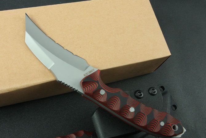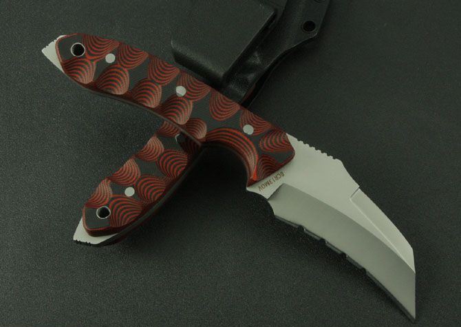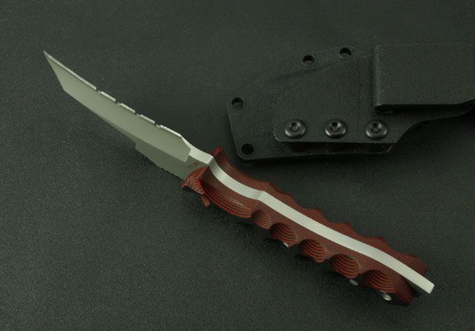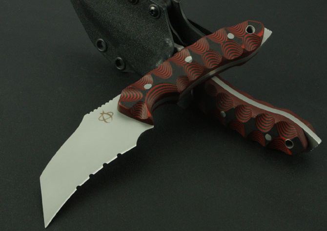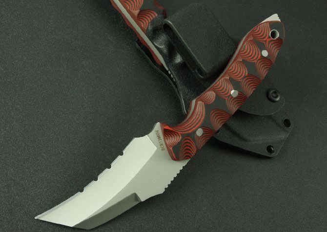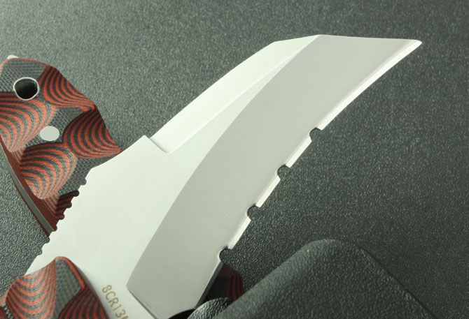 外贸版—螳螂神爪 全 长:210mm 刃 长:85mm 柄 长:125mm 刃 宽:36mm 刃 厚:5.1mm 刃 材:8Cr13Mov(高碳钢) 重 量:300g(含包装) 硬 度:59HRC{真空热处理) 表 面:拉砂+氧化灰 柄 材:多层G10 刀 鞘:ABS塑料刀套