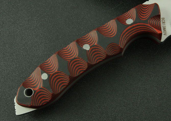 全 长:210mm 刃 长:85mm 柄 长:125mm 刃 宽:36mm 刃 厚:5.1mm 刃 材:8Cr13Mov(高碳钢) 重 量:300g(含包装) 硬 度:59HRC{真空热处理) 表 面:拉砂+氧化灰 柄 材:多层G10 刀 鞘:ABS塑料刀套