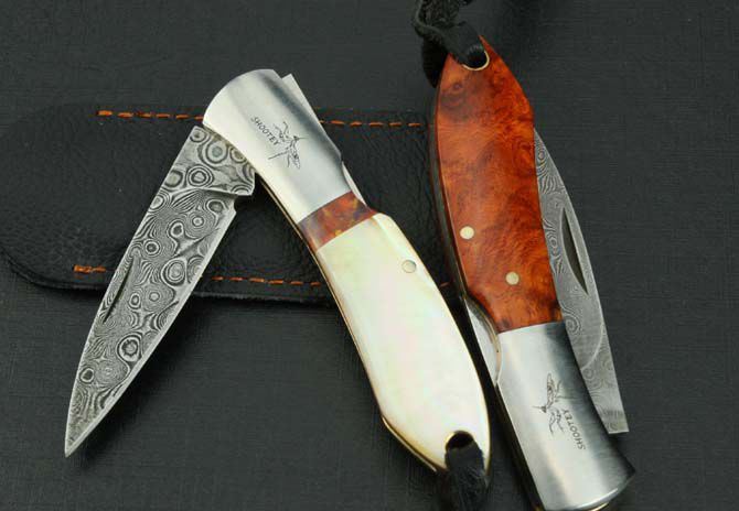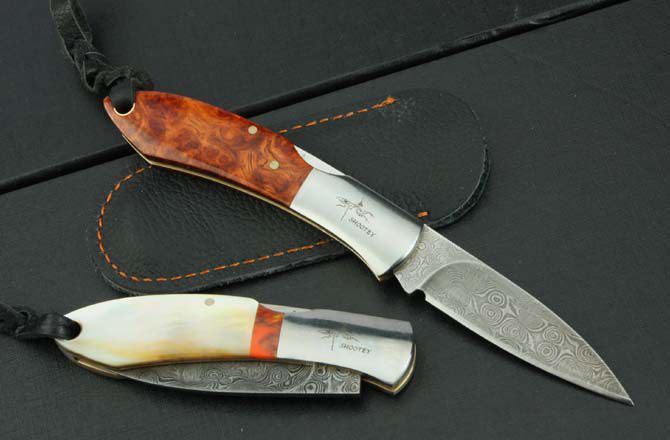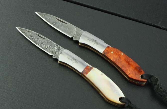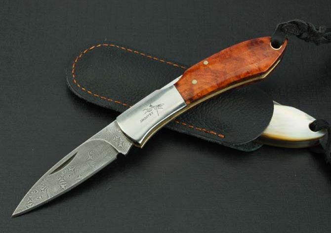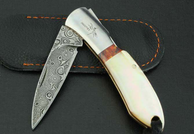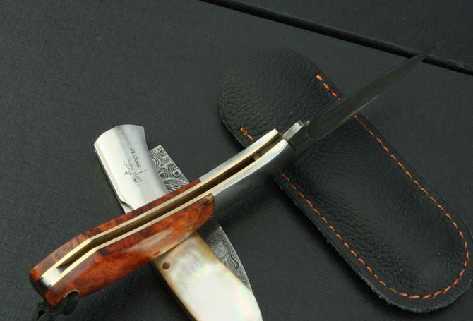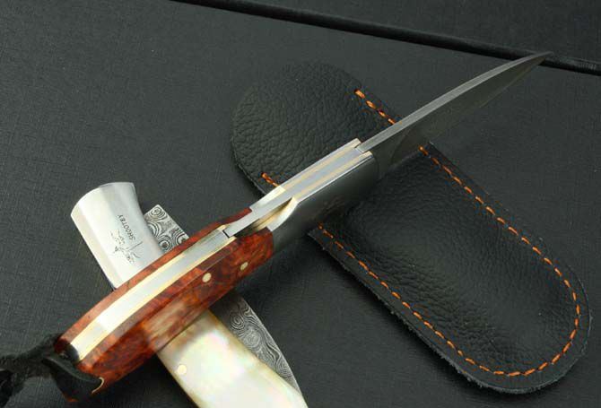 螳螂手工版—小贵妃(红影木柄和贝壳柄) 全 长:135mm 刃 长:50mm 柄 长:80mm 刃 宽:15mm 刃 厚:2.2mm 刃 材:日本进口大马士革 重 量:55g(含包装) 硬 度:58—60HRC 表 面:大马士革原纹 柄 材:红影木柄和贝壳柄 锁 型:制尾 其 他:配皮套