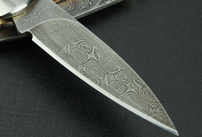 全 长:135mm 刃 长:50mm 柄 长:80mm 刃 宽:15mm 刃 厚:2.2mm 刃 材:日本进口大马士革 重 量:55g(含包装) 硬 度:58—60HRC 表 面:大马士革原纹 柄 材:红影木柄和贝壳柄 锁 型:制尾 其 他:配皮套
