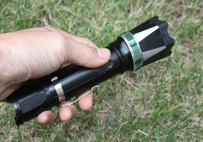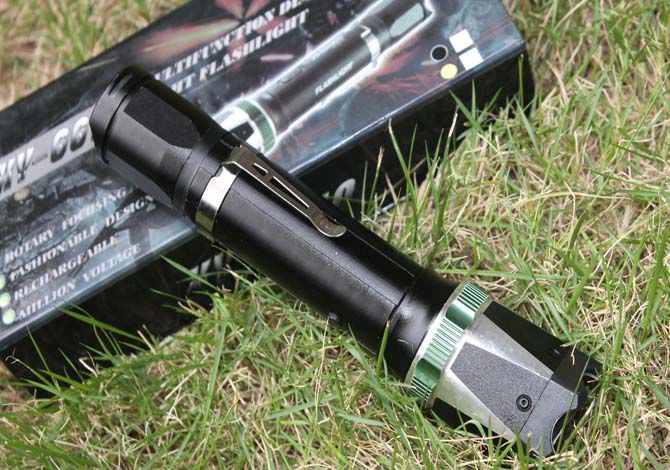 1、尾部总开关打开,中间长方形开关往前推,是照明档位,反复几次可以强光、弱光、爆闪,旋转调焦环可以聚光。