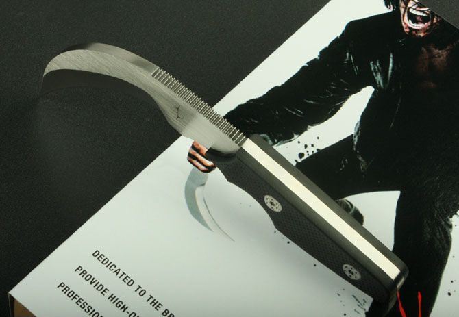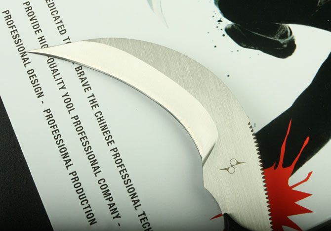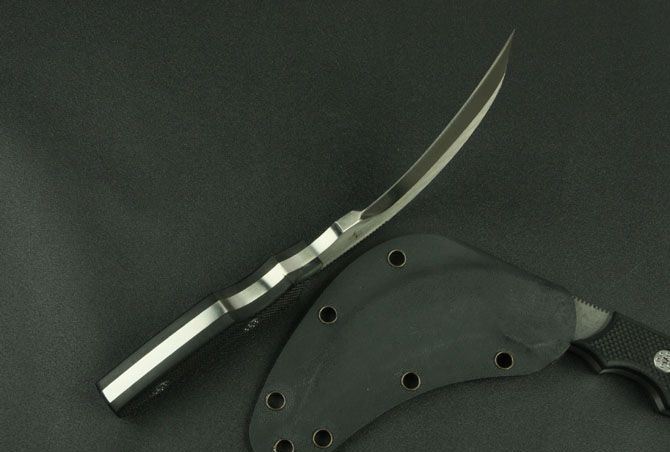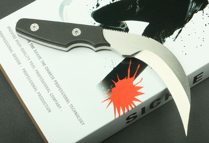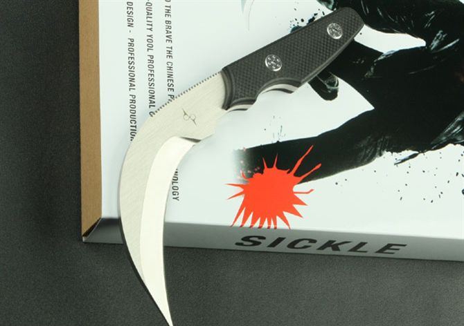 狂镰天下 全 长: 19.6cm 刃 长: 10cm 刃 厚: 0.57CM 刃 材: GB-D2 净 重: 410g 硬 度: 58-60Hrc 柄 材: 黑色G10 表 面: 手工砂光 刀 套: 进口K鞘
