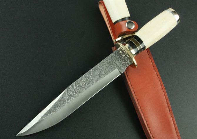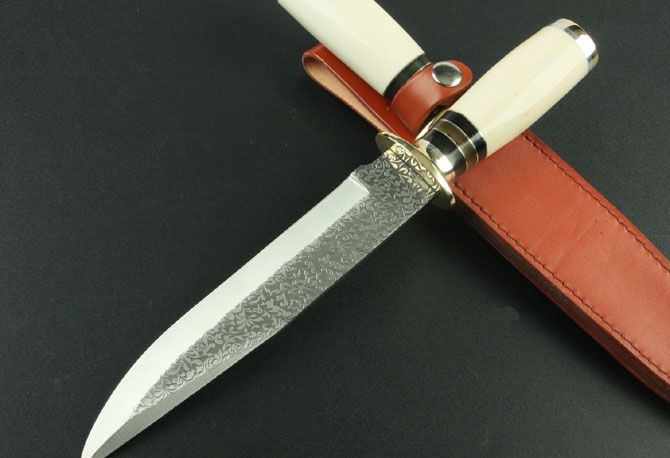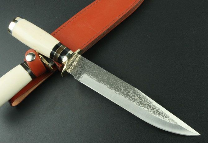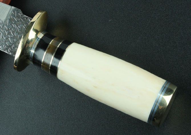 锻花兽骨直刀(大号) 全长:31.8cm 刀刃:18.5cm 刃厚:0.44cm 刃宽:3.3CM 柄长:11.2cm 柄材:铜头+兽骨 硬度:57HRC 净重:400克 毛重:480克(含皮套) 表面处理:纯手工锻打