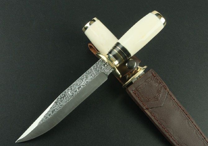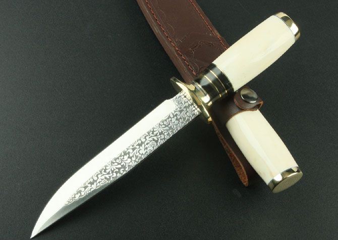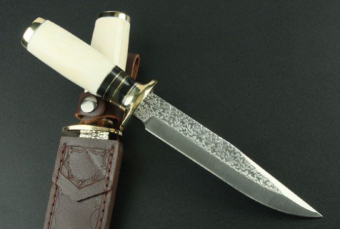 锻花兽骨直刀(中号) 全长:26.6cm 刀刃:15.2cm 刃厚:0.4cm 刃宽:2.7CM 柄长:10.5cm 柄材:铜头+兽骨 硬度:57HRC 净重:300克 毛重:360克(含皮套) 表面处理:纯手工锻打