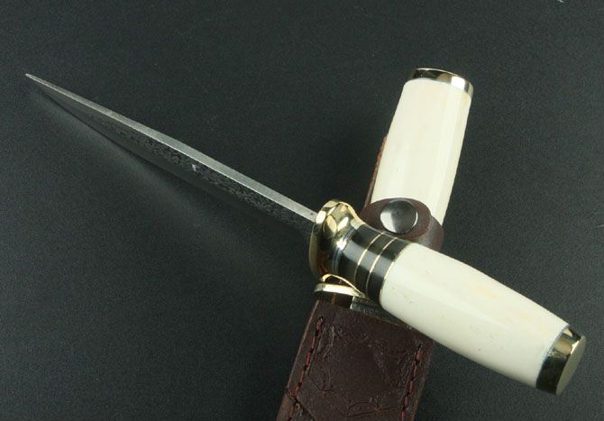 全长:26.6cm 刀刃:15.2cm 刃厚:0.4cm 刃宽:2.7CM 柄长:10.5cm 柄材:铜头+兽骨 硬度:57HRC 净重:300克 毛重:360克(含皮套) 表面处理:纯手工锻打
