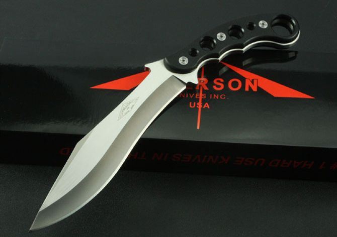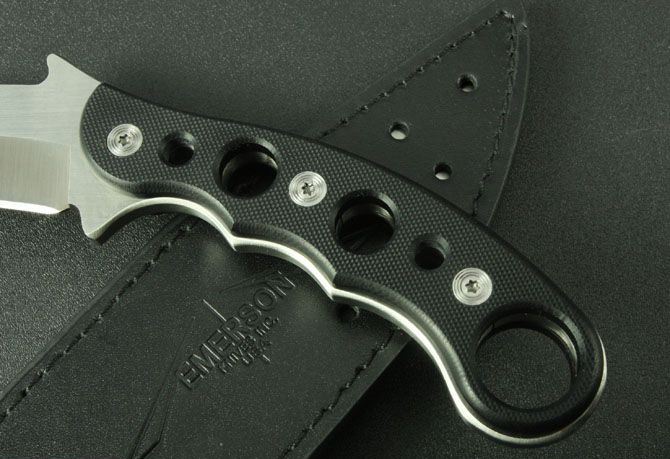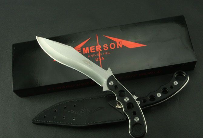 爱默森—狗腿刀“鲨鱼” 全 长:295mm 刃 长:180mm 柄 长:125mm 刃 宽:40mm 刃 厚:6.2mm 刃 材:7Cr17Mov 重 量:420g(含包装) 硬 度:58HRC{真空热处理) 表 面:砂光 柄 材:黑色G10 刀 鞘:皮套