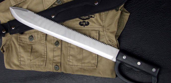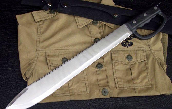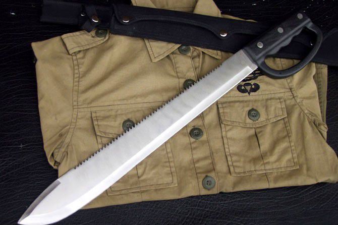 霹雳刀-白版背齿 全 长:57cm 刃 长:44cm 刃 厚:2.5mm 刃 材:420J2 柄 材:ABS 硬 度:57Hrc 表 面:金属拉丝 刀 套:尼龙