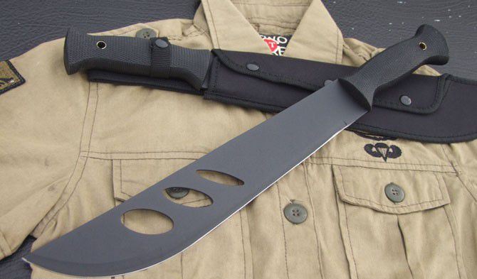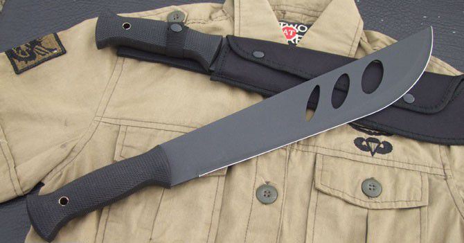 全 长:45cm 刃 长:32cm 刃 厚:2.5mm 刃 材:420J2 柄 材:橡塑 硬 度:57Hrc 表 面:烤漆 刀 套:尼龙
