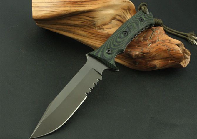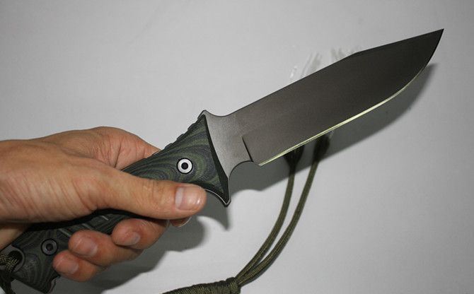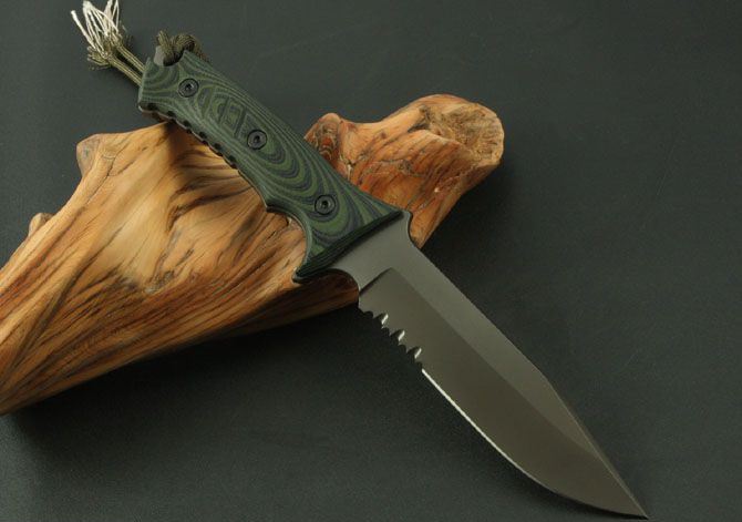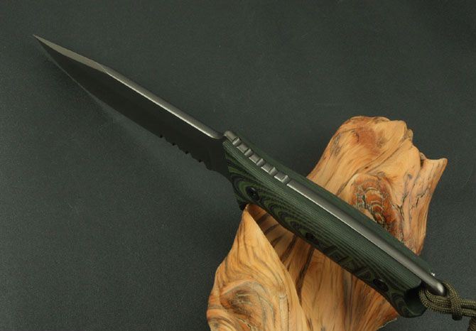 手工版绿扁帽战争纪念刀(全刃、半齿) 全 长:300mm 刃 长:148mm 柄 长:140mm 刃 宽:35mm 刃 厚:5.3mm 刃 材:D2 重 量:570g(含包装) 硬 度:59HRC(可以砍铁) 表 面:镀钛 柄 材:G10 锁 型:定锁 其 他:配防滑绳子