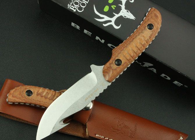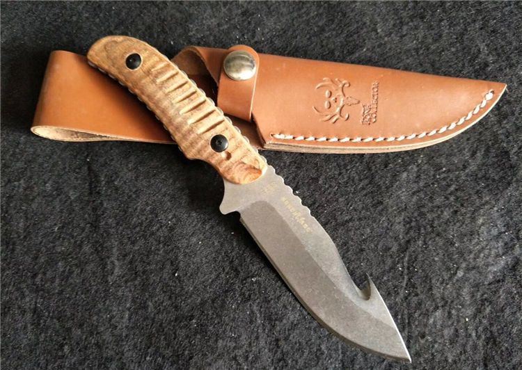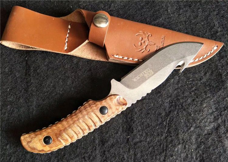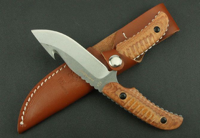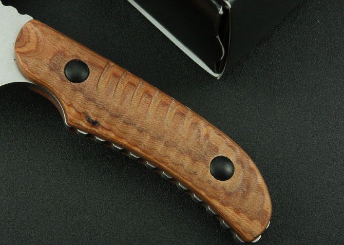 蝴蝶—骨干求生刀 全 长:205mm 刃 长:100mm 柄 长:102mm 刃 宽:30mm 刃 厚:3.6mm 刃 材:D2 重 量:220g(含包装) 硬 度:58HRC 表 面:石洗 柄 材:彩木 锁 型:定锁 其 他:配原厂彩盒+皮套