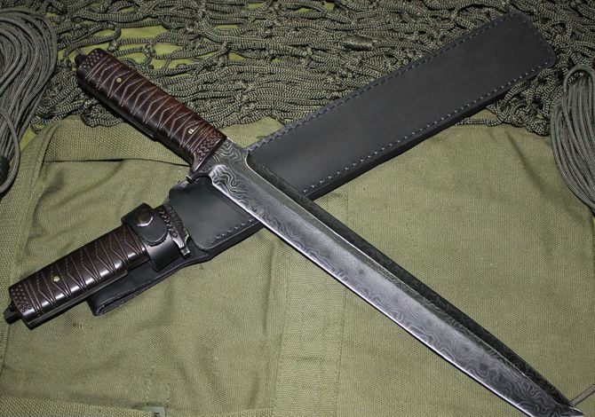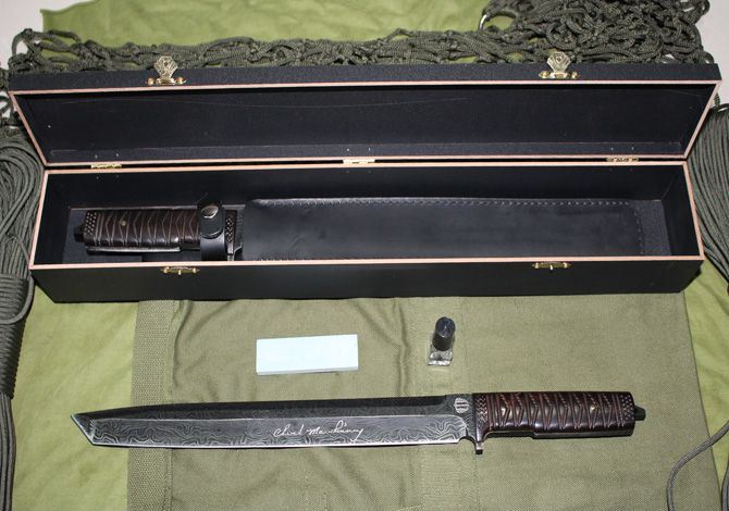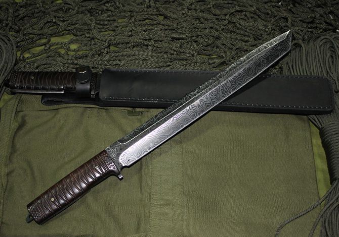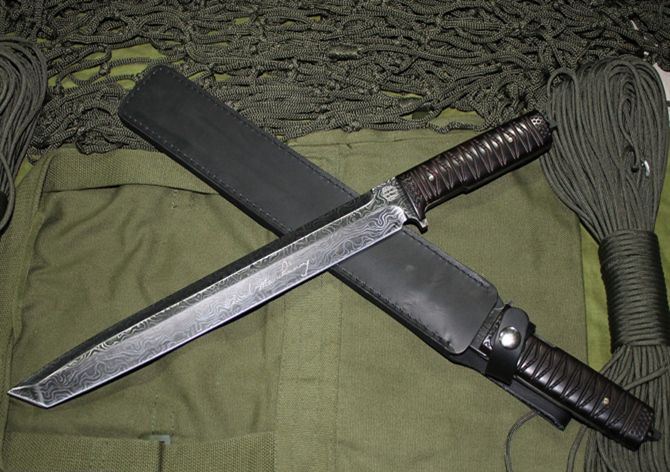 第二代波纹钢米克-武士长刀 全长:44.5cm 刃长:31.5cm 柄长:13cm 刃宽:3.5cm (最宽处) 刃厚:0.55cm 硬度:56HRC 刀重:500克 总重:680克 刃材:新型波纹钢,手工锻打,档次相当于大马士革钢,不刮花,不变色。 表面:不规则波纹,表面处理方法属于商业秘密 柄材:名贵黑檀(天然木材,人工雕刻) 品质:高品质 附件:牛皮刀套