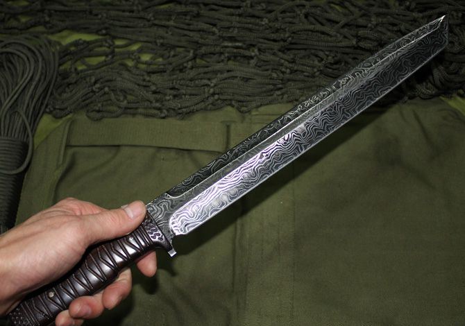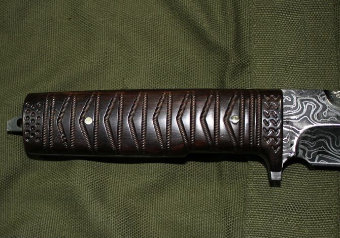 全长:44.5cm 刃长:31.5cm 柄长:13cm 刃宽:3.5cm (最宽处) 刃厚:0.55cm 硬度:56HRC 刀重:500克 总重:680克 刃材:新型波纹钢,手工锻打,档次相当于大马士革钢,不刮花,不变色。 表面:不规则波纹,表面处理方法属于商业秘密 柄材:名贵黑檀(天然木材,人工雕刻) 品质:高品质