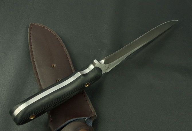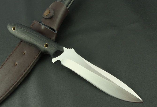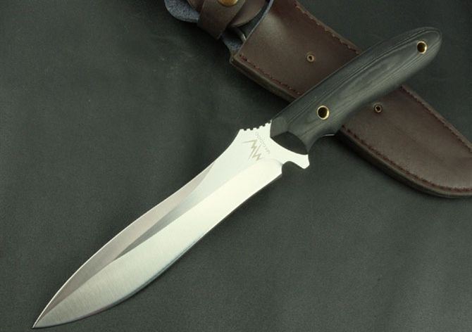 LM-009直刀 全 长:305mm 刃 长:165mm 柄 长:135mm 刃 宽:32mm 刃 厚:5.6mm 刃 材:5Cr13Mov 重 量:448g(含包装) 硬 度:56HRC 表 面:砂光 柄 材:米克塔 锁 型:定锁 其 他:配牛皮套