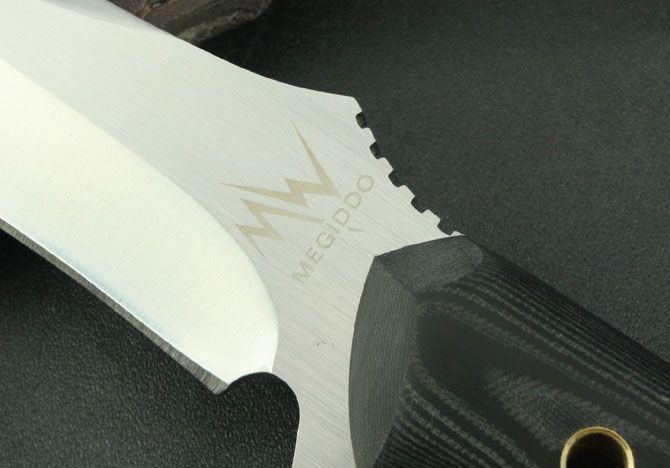 全 长:305mm 刃 长:165mm 柄 长:135mm 刃 宽:32mm 刃 厚:5.6mm 刃 材:5Cr13Mov 重 量:448g(含包装) 硬 度:56HRC 表 面:砂光 柄 材:米克塔 锁 型:定锁 其 他:配牛皮套