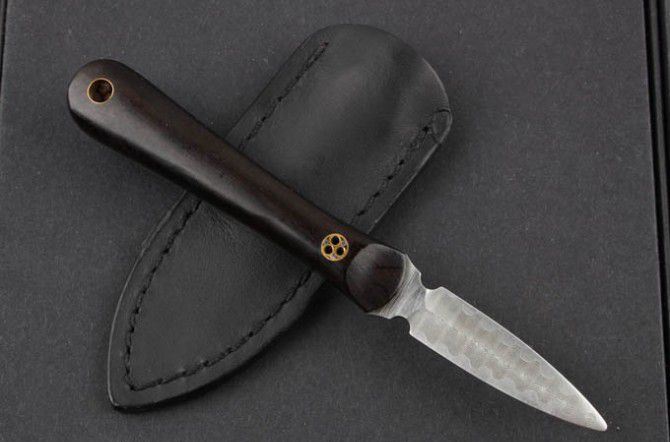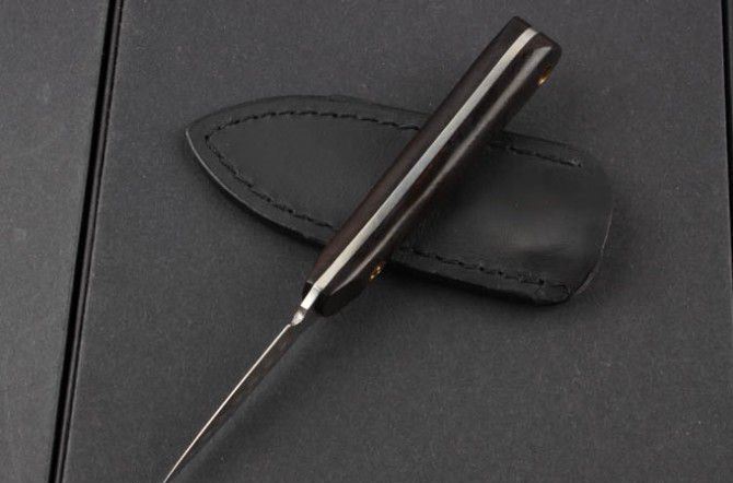 黑檀花梨-大马士革茶刀 全 长:144mm 刃 长:55mm 柄 长:90mm 刃 宽:13mm 刃 厚:2mm 刃 材:大马士革 重 量:68g(含包装) 硬 度:58HRC 表 面:钢本色 柄 材:黑檀木 锁 型:定锁 其 他:配牛皮套