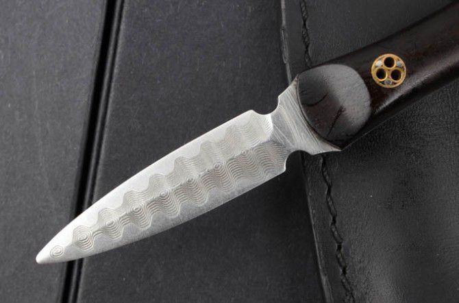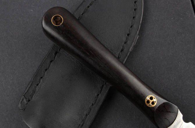 全 长:144mm 刃 长:55mm 柄 长:90mm 刃 宽:13mm 刃 厚:2mm 刃 材:大马士革 重 量:68g(含包装) 硬 度:58HRC 表 面:钢本色 柄 材:黑檀木 锁 型:定锁 其 他:配牛皮套