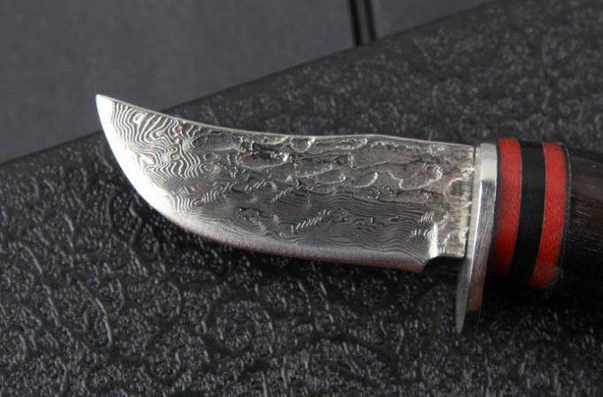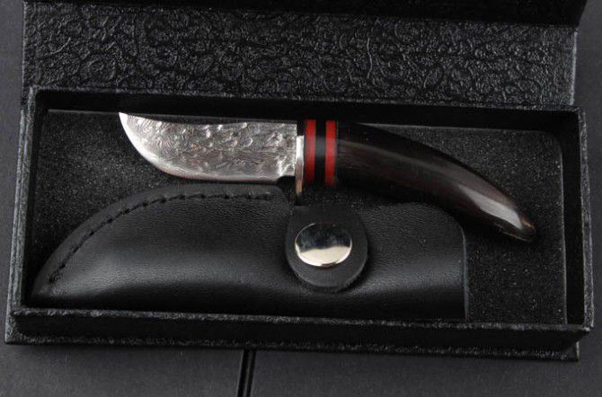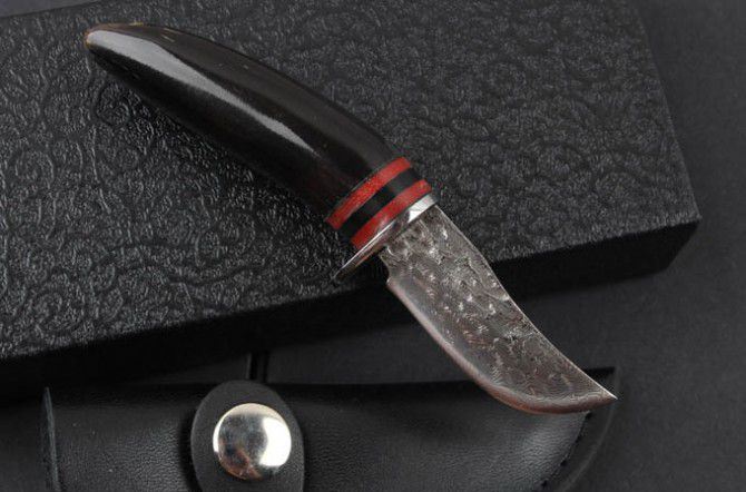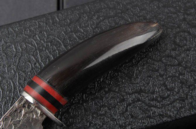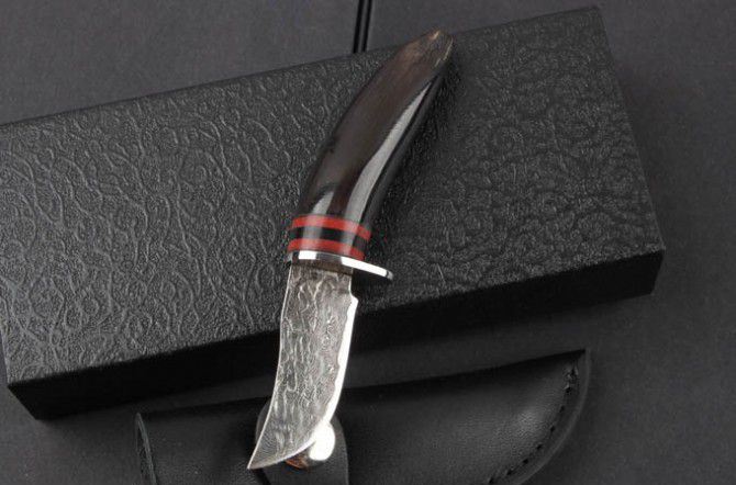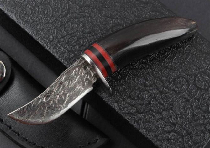 水牛角-大马士革刀 全 长:120mm 刃 长:50mm 柄 长:72mm 刃 宽:17mm 刃 厚:2.8mm 刃 材:大马士革 重 量:128g(含包装) 硬 度:58HRC 表 面:大马士革原色 柄 材:水牛角 锁 型:定锁 其 他:配牛皮套