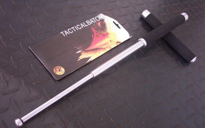 棍体材料:高强度合金钢, 硬度大概58HRC(经测试,能吊起一辆汽车以上的重量) 棍把材料:黑色乙烯基合成(防滑材质,不会因流汗潮湿而滑手) 收缩长19.7 CM (便携隐蔽) 甩出长51.8 CM (常用长度) 净重:480克 表面:硬铬银色(永不掉色) 原版双面吸卡包装 其他性能:钢卡式,专门在接口处精密处理,处理后甩出锁定牢靠, 收回时,朝地面垂直一磕就回去了。