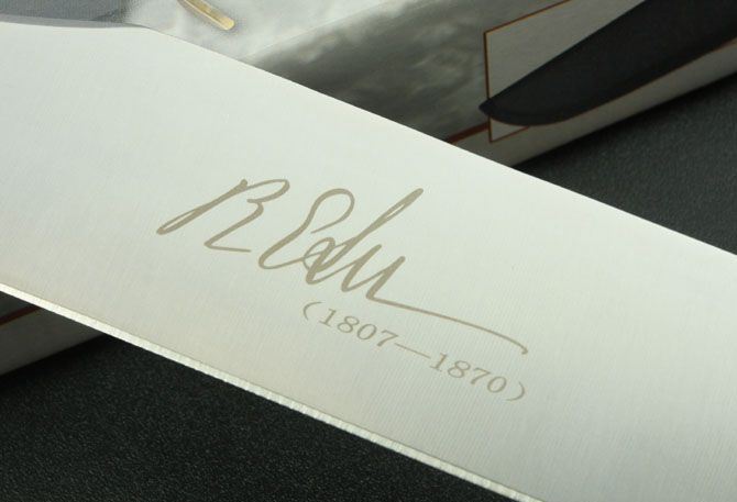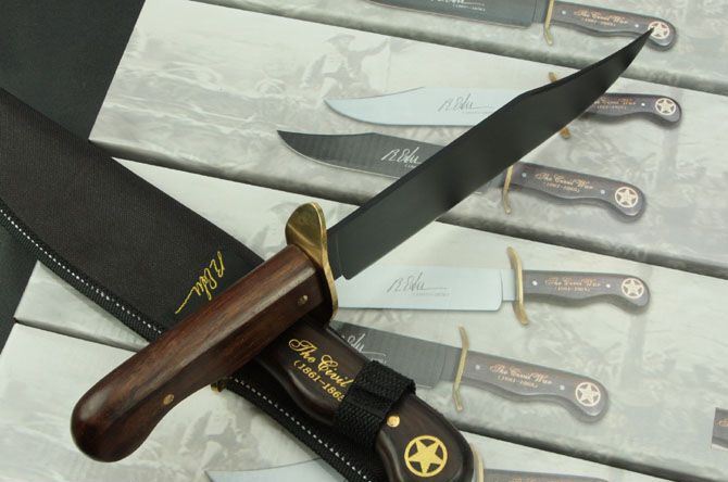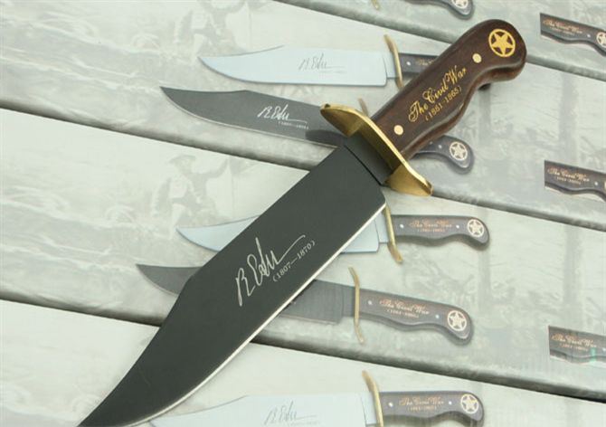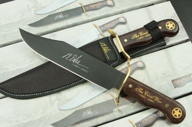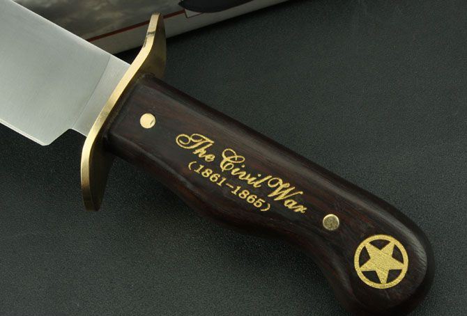 美国内战纪念刀(黑色、白色) 全 长:335mm 刃 长:200mm 柄 长:120mm 刃 宽:42mm 刃 厚:3.7mm 刃 材:5Cr13Mov 重 量:290g(含包装) 硬 度:57HRC 表 面:砂光和氧化黑 柄 材:原木柄 锁 型:定锁 其 他:配尼龙套和彩盒