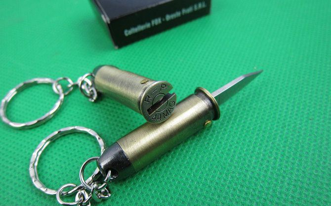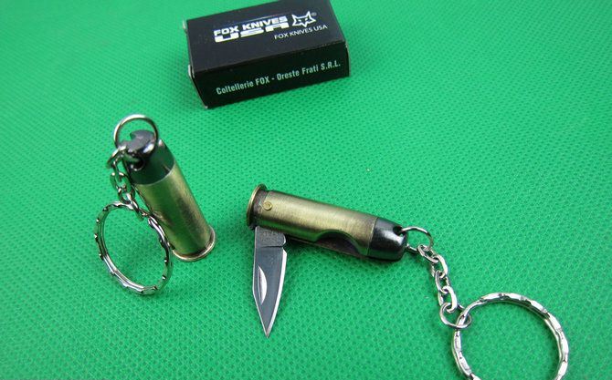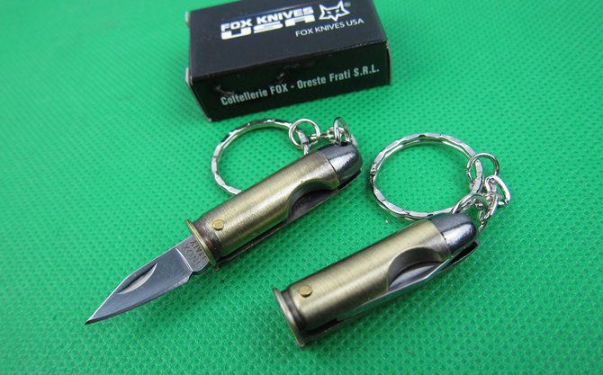 狐狸匙扣子弹小刀 全长:6.7cm 刃长:2.2cm 柄长:4.1cm 刃厚:0.18cm 刃宽:0.7cm 刃材:5Cr13 柄材:古铜色 硬度:56HRC 净重;20克 表面处:沙光 其他:原厂彩合