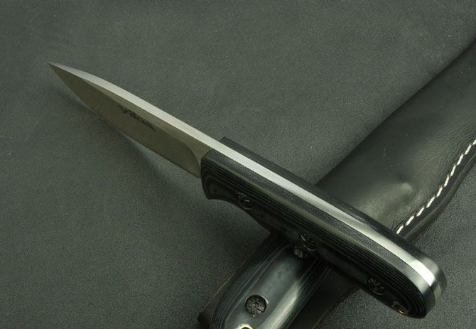 全 长:200mm 刃 长:90mm 柄 长:103mm 刃 宽:30mm 刃 厚:3.8mm 刃 材:5Cr13Mov 重 量:238g(含包装) 硬 度:57HRC 表 面:拉丝 柄 材:米克塔 锁 型:定锁 其 他:牛皮套