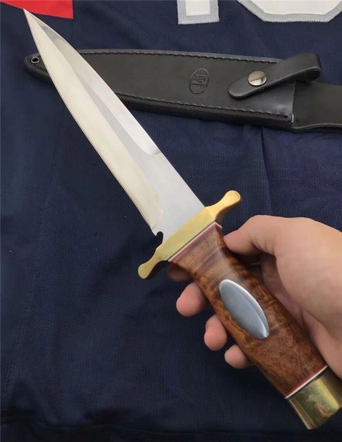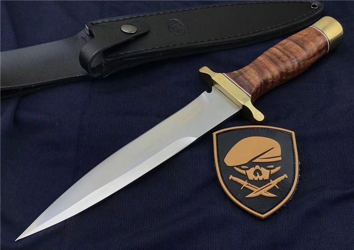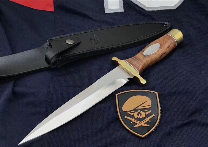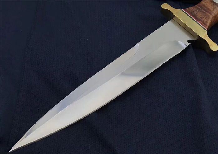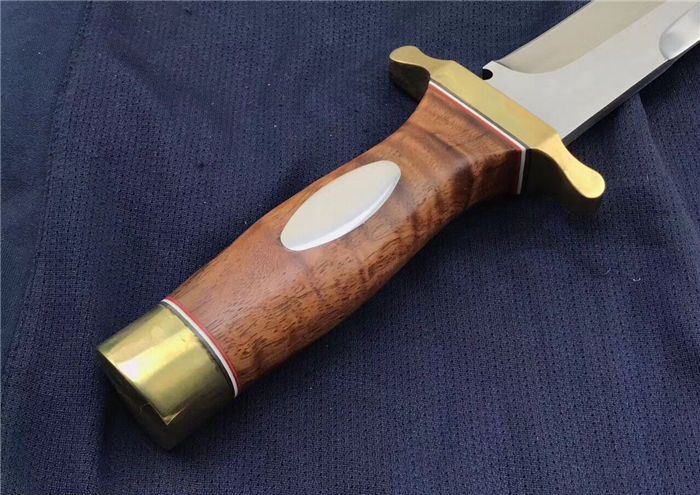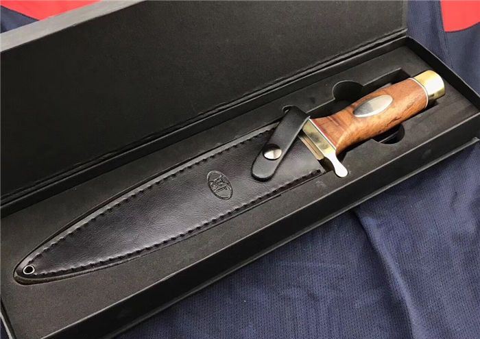 全长:352 MM 刃长:2 20 MM 刃厚:5.0 MM 护手宽: 82 MM 护手厚度:10MM 柄长:122 MM 刀净重:500克+450克(刀套包装盒) 刃材:锻打9Cr14MoV 硬度:59度(真空深冷热处理) 尾部局部退火处理,尾部硬度53度左右 柄材:进口缅甸红酸枝 刀套:黑色头层皮 刃面镜面处理,表面极幼拉丝。 护手铜材质,镜光处理。表面涂防氧化物