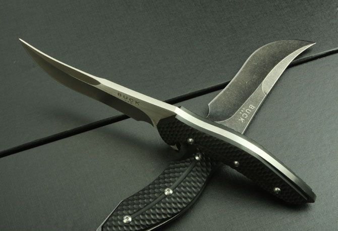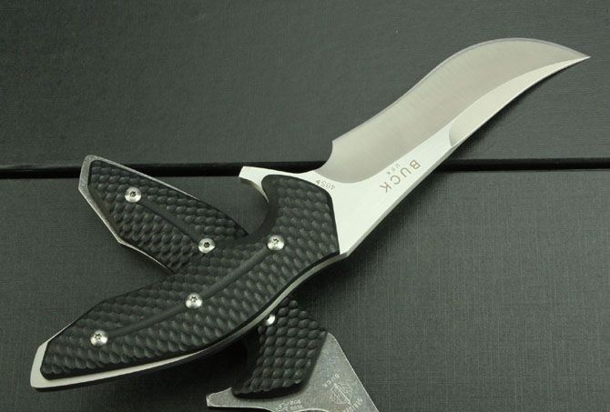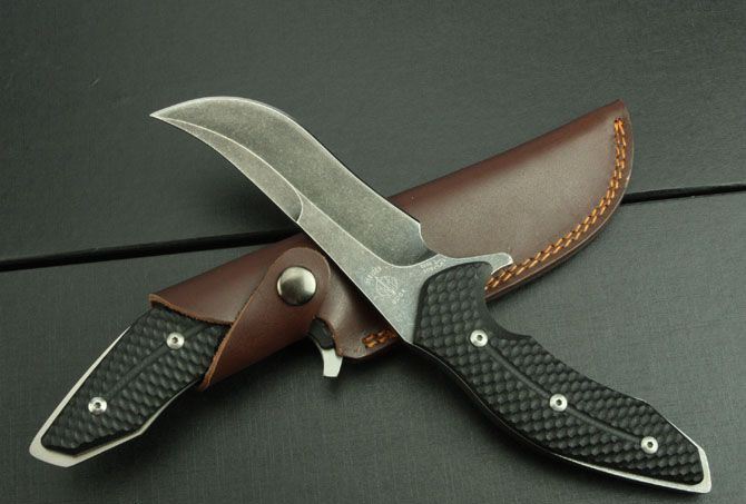 巴克N2双色弯刀(黑色、白色) 全 长:255mm 刃 长:120mm 柄 长:130mm 刃 宽:36mm 刃 厚:4.8mm 刃 材:5Cr13Mov 重 量:360g(含包装) 硬 度:57HRC 表 面:砂光和石洗 柄 材:黑G10 锁 型:定锁 其 他:配牛皮套+牛皮纸盒